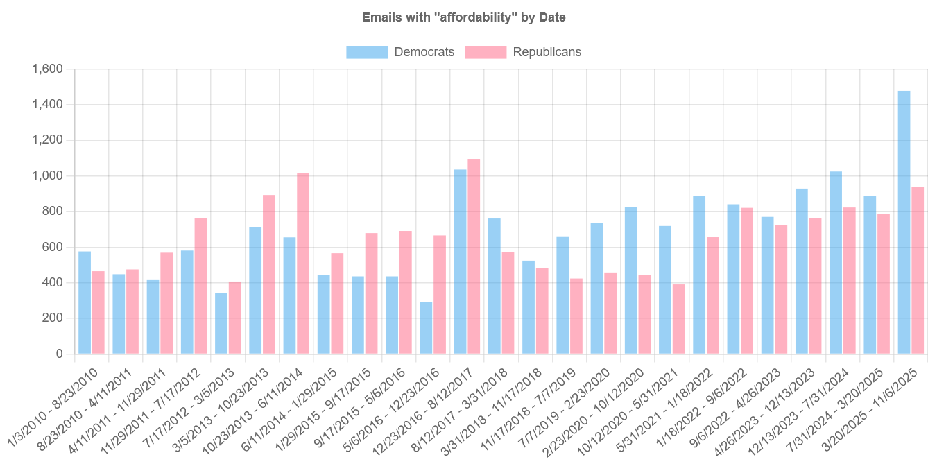 Affordability is a familiar theme in American politics, but it’s often been used with a modifier: Politicians talk about college affordability, or health care costs, more often than the one word on its own, and the use of the word has gained traction in just the last year, as measured by its use in official emails from Democrats in Congress.